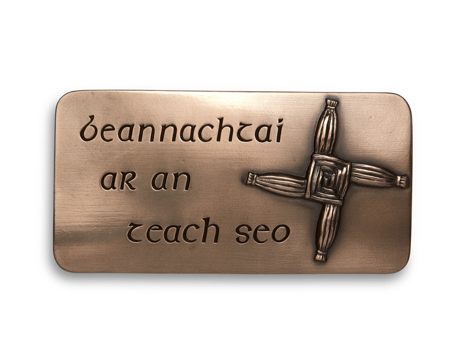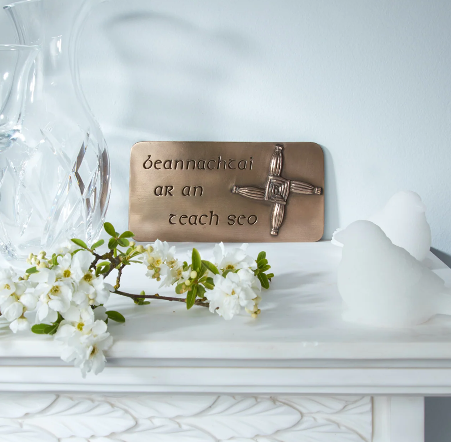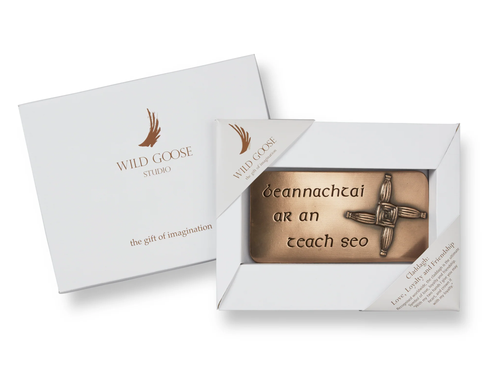 To protect the home. Usually woven from reeds, the St Brigid's Cross is thought to protect the home. This wall hanging comes with the Irish phrase, which means: blessings on this house. There are many folk traditions associated with St Brigid, which are still celebrated in rural Ireland. This is an original design carved by Adam Grabski, which has a carefully polished pure bronze finish with a ceramic resin cold cast pouring. This piece comes in a Wild Goose Studio presentation box which measures 9 x 6 inches (22 x 15cm).